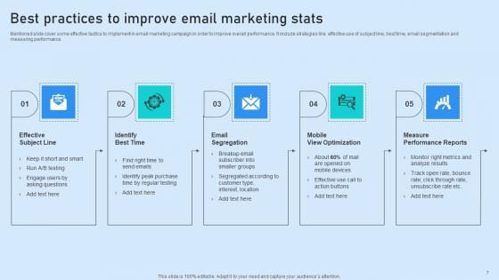 Mentioned slide cover some effective tactics to implement in email marketing campaign in order to improve overall performance. It include strategies like effective use of subject line, best time, email segmentation and measuring performance. Showcasing this set of slides titled Best Practices To Improve Email Marketing Stats Demonstration Pdf. The topics addressed in these templates are Subject Line, Email Segregation, View Optimization. All the content presented in this PPT design is completely editable. Download it and make adjustments in color, background, font etc. as per your unique business setting. Mentioned slide cover some effective tactics to implement in email marketing campaign in order to improve overall performance. It include strategies like effective use of subject line, best time, email segmentation and measuring performance.