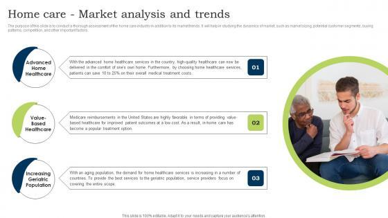 The purpose of this slide is to conduct a thorough assessment of the home care industry in addition to its market trends. It will help in studying the dynamics of market, such as market sizing, potential customer segments, buying patterns, competition, and other important factors. Crafting an eye-catching presentation has never been more straightforward. Let your presentation shine with this tasteful yet straightforward Go To Market Strategy Home Care Market Analysis And Trends Demonstration Pdf template. It offers a minimalistic and classy look that is great for making a statement. The colors have been employed intelligently to add a bit of playfulness while still remaining professional. Construct the ideal Go To Market Strategy Home Care Market Analysis And Trends Demonstration Pdf that effortlessly grabs the attention of your audience. Begin now and be certain to wow your customers. The purpose of this slide is to conduct a thorough assessment of the home care industry in addition to its market trends. It will help in studying the dynamics of market, such as market sizing, potential customer segments, buying patterns, competition, and other important factors.
