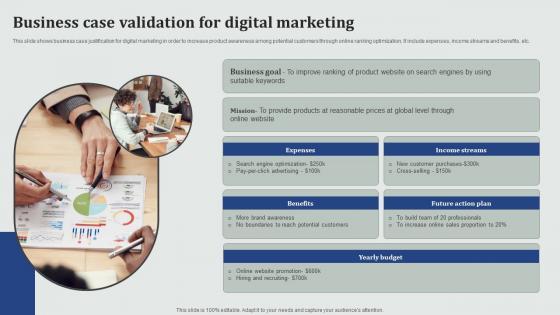 This slide shows business case justification for digital marketing in order to increase product awareness among potential customers through online ranking optimization, It include expenses, income streams and benefits, etc.Showcasing this set of slides titled Business Case Validation For Digital Marketing Elements Pdf The topics addressed in these templates are Products Reasonable, Improve Ranking, Future Action Plan All the content presented in this PPT design is completely editable. Download it and make adjustments in color, background, font etc. as per your unique business setting. This slide shows business case justification for digital marketing in order to increase product awareness among potential customers through online ranking optimization, It include expenses, income streams and benefits, etc.