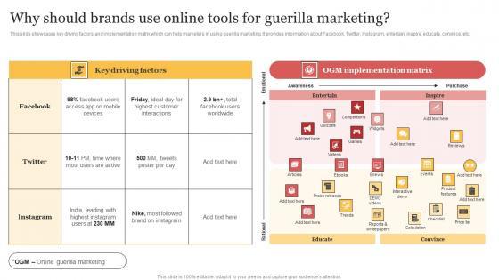 This slide showcases key driving factors and implementation matrix which can help marketers in using guerilla marketing. It provides information about Facebook, Twitter, Instagram, entertain, inspire, educate, convince, etc. From laying roadmaps to briefing everything in detail, our templates are perfect for you. You can set the stage with your presentation slides. All you have to do is download these easy-to-edit and customizable templates. Why Should Brands Use Online Tools For Guerilla Marketing Designing Approaches Diagrams Pdf will help you deliver an outstanding performance that everyone would remember and praise you for. Do download this presentation today. This slide showcases key driving factors and implementation matrix which can help marketers in using guerilla marketing. It provides information about Facebook, Twitter, Instagram, entertain, inspire, educate, convince, etc.