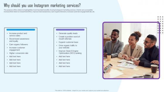 The purpose of this slide is to highlight the most important benefits of using Instagram marketing services. Clients can successfully increase their return on investment ROI, improve brand awareness, earn organic followers, increase customer engagement rate, etc. Take your presentations to the next level with our Why Should You Use Instagram Marketing Digital Platform Advertising Proposal Summary Pdf template. With its sleek design and seamless editing features, this single-slide PPT template is a game-changer for professionals who want to make an impact. Impress your audience with stunning visuals and engaging content that will capture their attention from start to finish. Get your hands on our template and elevate your presentations to new heights. The purpose of this slide is to highlight the most important benefits of using Instagram marketing services. Clients can successfully increase their return on investment ROI, improve brand awareness, earn organic followers, increase customer engagement rate, etc.