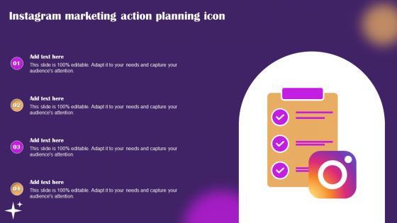 Pitch your topic with ease and precision using this Instagram Marketing Action Planning Icon Ppt File Samples pdf. This layout presents information on Instagram Marketing, Action Planning, Icon. It is also available for immediate download and adjustment. So, changes can be made in the color, design, graphics or any other component to create a unique layout. Our Instagram Marketing Action Planning Icon Ppt File Samples pdf are topically designed to provide an attractive backdrop to any subject. Use them to look like a presentation pro.