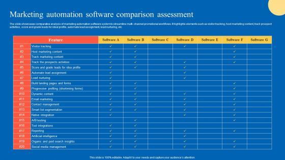 The slide showcases comparative analysis of marketing automation software system to streamline multi channel promotional workflows. It highlights elements such as visitor tracking, host marketing content, track prospect activities, score and grade leads for ideal profile, automate lead assignment, lead nurturing, etc. Welcome to our selection of the Marketing Automation Strategic Guide For Marketing Program Rules Pdf. These are designed to help you showcase your creativity and bring your sphere to life. Planning and Innovation are essential for any business that is just starting out. This collection contains the designs that you need for your everyday presentations. All of our PowerPoints are 100 percent editable, so you can customize them to suit your needs. This multi purpose template can be used in various situations. Grab these presentation templates today. The slide showcases comparative analysis of marketing automation software system to streamline multi- channel promotional workflows. It highlights elements such as visitor tracking, host marketing content, track prospect activities, score and grade leads for ideal profile, automate lead assignment, lead nurturing, etc.