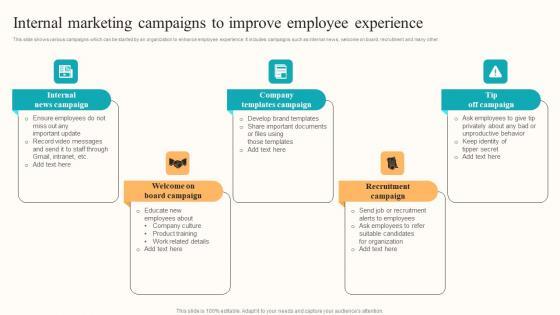 This slide shows various campaigns which can be started by an organization to enhance employee experience. It includes campaigns such as internal news, welcome on board, recruitment and many other. Whether you have daily or monthly meetings, a brilliant presentation is necessary. Internal Marketing Campaigns Developing Employee Centric Marketing Program Formats Pdf can be your best option for delivering a presentation. Represent everything in detail using Internal Marketing Campaigns Developing Employee Centric Marketing Program Formats Pdf and make yourself stand out in meetings. The template is versatile and follows a structure that will cater to your requirements. All the templates prepared by Slidegeeks are easy to download and edit. Our research experts have taken care of the corporate themes as well. So, give it a try and see the results. This slide shows various campaigns which can be started by an organization to enhance employee experience. It includes campaigns such as internal news, welcome on board, recruitment and many other.