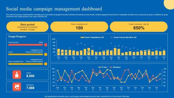 This slide showcases a dashboard for managing ad social media campaign to assists marketers in tracking success of ads, content engagement and reach. It highlights element such as date period, goals completion all, goals conversion rate, target progress bar, users, sessions, etc. Do you have an important presentation coming up Are you looking for something that will make your presentation stand out from the rest Look no further than Social Media Campaign Strategic Guide For Marketing Program Icons Pdf. With our professional designs, you can trust that your presentation will pop and make delivering it a smooth process. And with Slidegeeks, you can trust that your presentation will be unique and memorable. So why wait Grab Social Media Campaign Strategic Guide For Marketing Program Icons Pdf today and make your presentation stand out from the rest. This slide showcases a dashboard for managing ad social media campaign to assists marketers in tracking success of ads, content engagement and reach. It highlights element such as date period, goals completion all, goals conversion rate, target progress bar, users, sessions, etc.