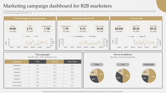 The following slide showcases key performance indicator KPI dashboard that can assist managers to evaluate digital marketing campaign performance. The key metrics mentioned in the slide are click-through-rate CTR, conversion rate, cost per click CPC, etc. Are you in need of a template that can accommodate all of your creative concepts This one is crafted professionally and can be altered to fit any style. Use it with Google Slides or PowerPoint. Include striking photographs, symbols, depictions, and other visuals. Fill, move around, or remove text boxes as desired. Test out color palettes and font mixtures. Edit and save your work, or work with colleagues. Download IT Industry Market Research Marketing Campaign Dashboard For B2b Marketers Demonstration Pdf and observe how to make your presentation outstanding. Give an impeccable presentation to your group and make your presentation unforgettable. The following slide showcases key performance indicator KPI dashboard that can assist managers to evaluate digital marketing campaign performance. The key metrics mentioned in the slide are click-through-rate CTR, conversion rate, cost per click CPC, etc.