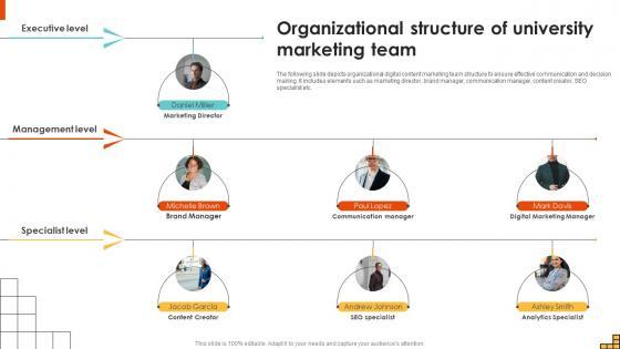 The following slide depicts organizational digital content marketing team structure to ensure effective communication and decision making. It includes elements such as marketing director, brand manager, communication manager, content creator, SEO specialist etc. Retrieve professionally designed Organizational Structure Of University Marketing Team Running Marketing Campaigns Strategy SS V to effectively convey your message and captivate your listeners. Save time by selecting pre-made slideshows that are appropriate for various topics, from business to educational purposes. These themes come in many different styles, from creative to corporate, and all of them are easily adjustable and can be edited quickly. Access them as PowerPoint templates or as Google Slides themes. You do not have to go on a hunt for the perfect presentation because Slidegeeks got you covered from everywhere. The following slide depicts organizational digital content marketing team structure to ensure effective communication and decision making. It includes elements such as marketing director, brand manager, communication manager, content creator, SEO specialist etc.