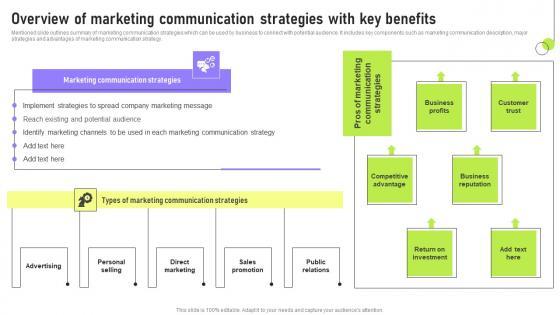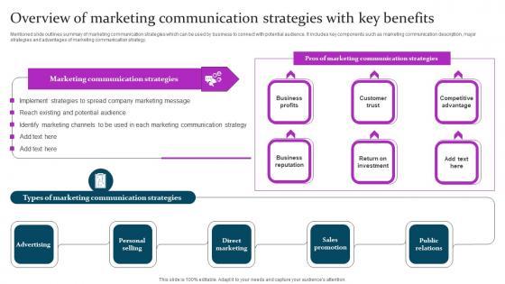 Mentioned slide outlines summary of marketing communication strategies which can be used by business to connect with potential audience. It includes key components such as marketing communication description, major strategies and advantages of marketing communication strategy. Coming up with a presentation necessitates that the majority of the effort goes into the content and the message you intend to convey. The visuals of a PowerPoint presentation can only be effective if it supplements and supports the story that is being told. Keeping this in mind our experts created Overview Of Marketing Communication Strategies With Key Benefits Themes PDF to reduce the time that goes into designing the presentation. This way, you can concentrate on the message while our designers take care of providing you with the right template for the situation.