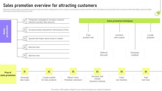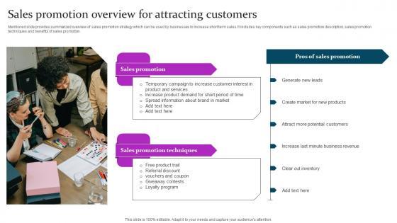 Mentioned slide provides summarized overview of sales promotion strategy which can be used by businesses to increase short term sales. It includes key components such as sales promotion description, sales promotion techniques and benefits of sales promotion. If your project calls for a presentation, then Slidegeeks is your go to partner because we have professionally designed, easy to edit templates that are perfect for any presentation. After downloading, you can easily edit Sales Promotion Overview For Attracting Deployment Of Marketing Communication Summary Pdf and make the changes accordingly. You can rearrange slides or fill them with different images. Check out all the handy templates Mentioned slide provides summarized overview of sales promotion strategy which can be used by businesses to increase short term sales. It includes key components such as sales promotion description, sales promotion techniques and benefits of sales promotion.