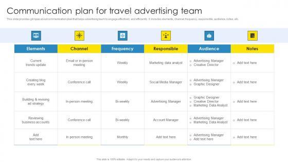 This slide provides glimpse about communication plan that helps advertising team to engage effectively and efficiently. It includes elements, channel, frequency, responsible, audience, notes, etc. Slidegeeks is here to make your presentations a breeze with Tour And Travel Agency Marketing Communication Plan For Travel Advertising Team Summary PDF With our easy-to-use and customizable templates, you can focus on delivering your ideas rather than worrying about formatting. With a variety of designs to choose from, you are sure to find one that suits your needs. And with animations and unique photos, illustrations, and fonts, you can make your presentation pop. So whether you are giving a sales pitch or presenting to the board, make sure to check out Slidegeeks first.