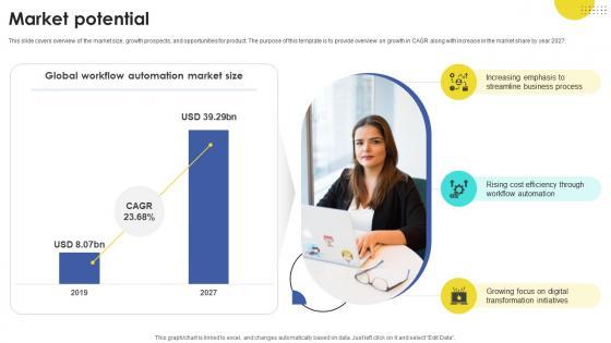 This slide covers overview of the market size, growth prospects, and opportunities for product. The purpose of this template is to provide overview on growth in CAGR along with increase in the market share by year 2027. If you are looking for a format to display your unique thoughts, then the professionally designed Market Potential Task Automation Company Investor Funding Elevator Pitch Deck is the one for you. You can use it as a Google Slides template or a PowerPoint template. Incorporate impressive visuals, symbols, images, and other charts. Modify or reorganize the text boxes as you desire. Experiment with shade schemes and font pairings. Alter, share or cooperate with other people on your work. Download Market Potential Task Automation Company Investor Funding Elevator Pitch Deck and find out how to give a successful presentation. Present a perfect display to your team and make your presentation unforgettable. This slide covers overview of the market size, growth prospects, and opportunities for product. The purpose of this template is to provide overview on growth in CAGR along with increase in the market share by year 2027.