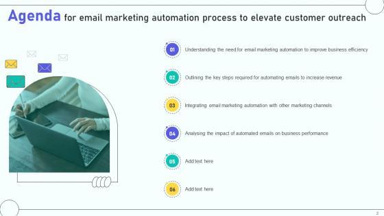 Do you have to make sure that everyone on your team knows about any specific topic I yes, then you should give Agenda For Email Marketing Automation Process To Elevate Customer Outreach a try. Our experts have put a lot of knowledge and effort into creating this impeccable Agenda For Email Marketing Automation Process To Elevate Customer Outreach. You can use this template for your upcoming presentations, as the slides are perfect to represent even the tiniest detail. You can download these templates from the Slidegeeks website and these are easy to edit. So grab these today Our Agenda For Email Marketing Automation Process To Elevate Customer Outreach are topically designed to provide an attractive backdrop to any subject. Use them to look like a presentation pro.