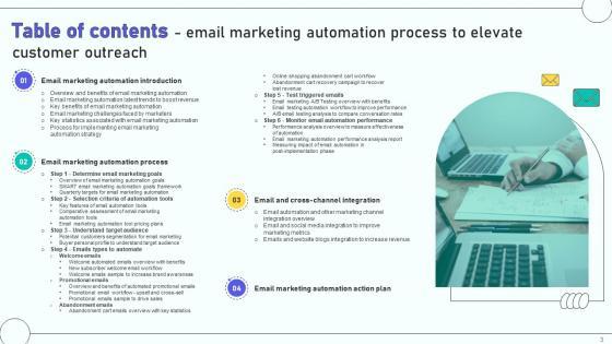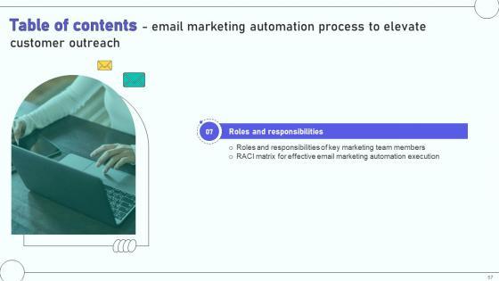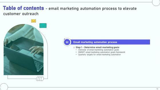 Do you have an important presentation coming up Are you looking for something that will make your presentation stand out from the rest Look no further than Table Of Contents Email Marketing Automation Process To Elevate Customer Outreach. With our professional designs, you can trust that your presentation will pop and make delivering it a smooth process. And with Slidegeeks, you can trust that your presentation will be unique and memorable. So why wait Grab Table Of Contents Email Marketing Automation Process To Elevate Customer Outreach today and make your presentation stand out from the rest Our Table Of Contents Email Marketing Automation Process To Elevate Customer Outreach are topically designed to provide an attractive backdrop to any subject. Use them to look like a presentation pro.