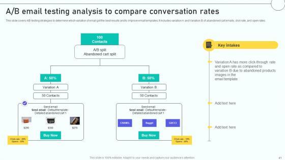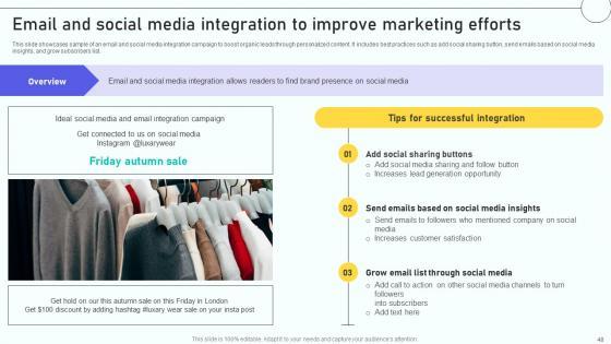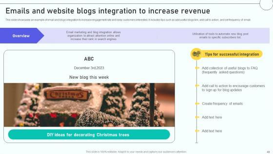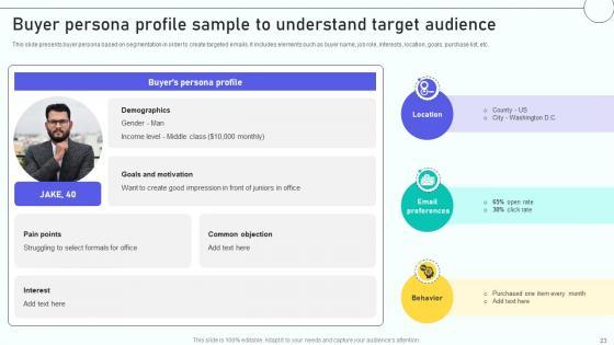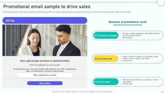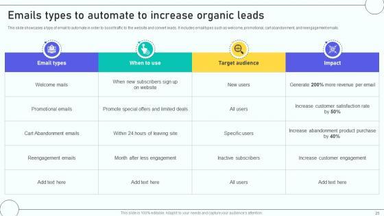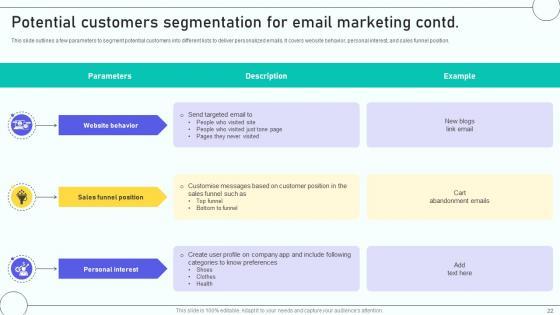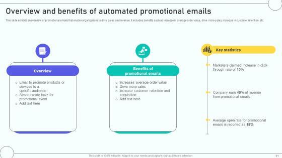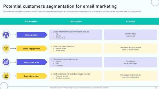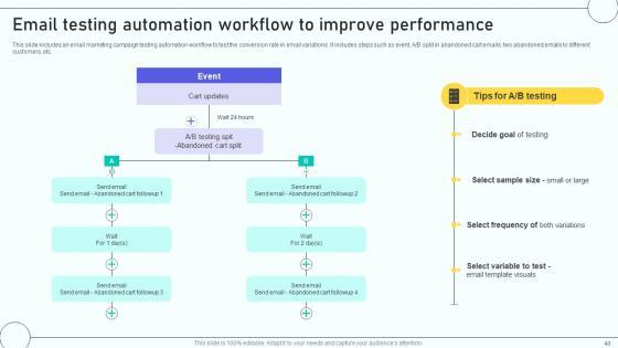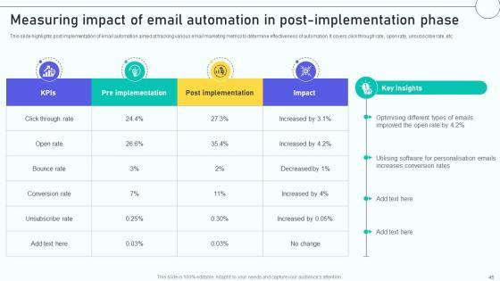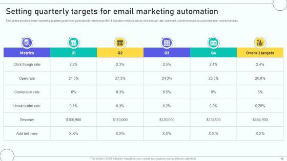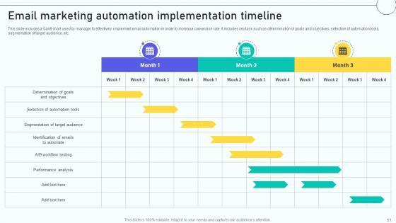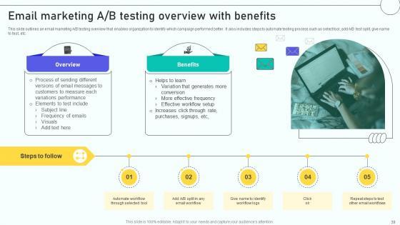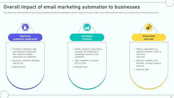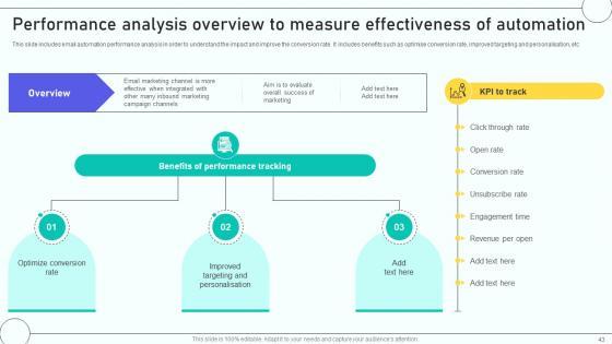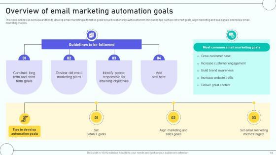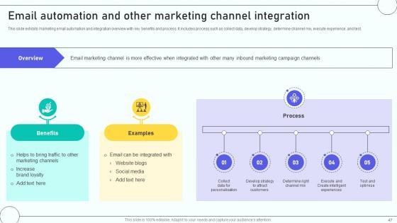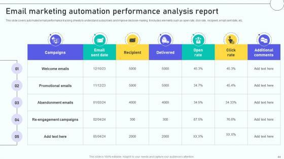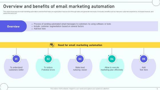 You will save yourself your energy and hours of time when you choose to use this impactful PowerPoint Deck. This Email Marketing Automation Process To Elevate Customer Outreach Ppt Powerpoint Presentation Complete Deck has been tailor-made to your business needs which ensures that you will always be prepared for that next meeting. Worry can not touch you when you present in your area of expertise using this PPT Template Bundle. With a modern design and easy to follow structure, this PowerPoint Presentation has Seventy Six slides, which ensures that you can cover you need to without much work. Create your next presentation using this PPT Theme to deliver a memorable performance. Our Email Marketing Automation Process To Elevate Customer Outreach Ppt Powerpoint Presentation Complete Deck are topically designed to provide an attractive backdrop to any subject. Use them to look like a presentation pro.