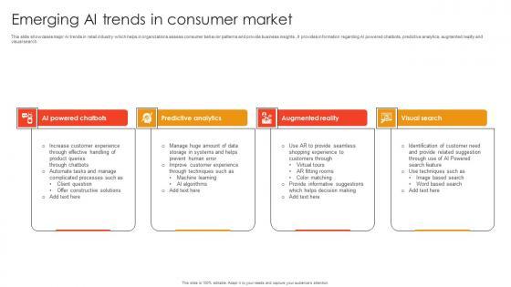 This slide showcases major AI trends in retail industry which helps in organizations assess consumer behavior patterns and provide business insights . It provides information regarding AI powered chatbots, predictive analytics, augmented reality and visual search. Showcasing this set of slides titled Emerging Ai Trends In Consumer Market Introduction Pdf. The topics addressed in these templates are AI Powered Chatbots, Predictive Analytics, Augmented Reality. All the content presented in this PPT design is completely editable. Download it and make adjustments in color, background, font etc. as per your unique business setting. This slide showcases major AI trends in retail industry which helps in organizations assess consumer behavior patterns and provide business insights . It provides information regarding AI powered chatbots, predictive analytics, augmented reality and visual search.