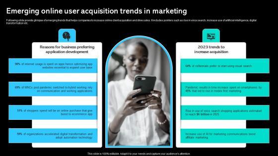 Following slide provide glimpse of emerging trends that helps companies to increase online client acquisition and drive sales. It includes pointers such as rise in voice search, increase use of artificial intelligence, digital transformation etc. Welcome to our selection of the Emerging Online User Acquisition Trends In Marketing Paid Marketing Approach Rules Pdf These are designed to help you showcase your creativity and bring your sphere to life. Planning and Innovation are essential for any business that is just starting out. This collection contains the designs that you need for your everyday presentations. All of our PowerPoints are 100 percent editable, so you can customize them to suit your needs. This multi-purpose template can be used in various situations. Grab these presentation templates today. Following slide provide glimpse of emerging trends that helps companies to increase online client acquisition and drive sales. It includes pointers such as rise in voice search, increase use of artificial intelligence, digital transformation etc.