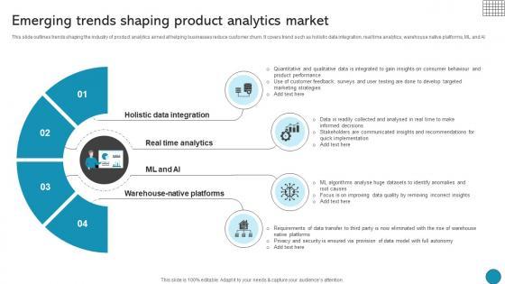 This slide outlines trends shaping the industry of product analytics aimed at helping businesses reduce customer churn. It covers trend such as holistic data integration, real time analytics, warehouse native platforms, ML and AI Coming up with a presentation necessitates that the majority of the effort goes into the content and the message you intend to convey. The visuals of a PowerPoint presentation can only be effective if it supplements and supports the story that is being told. Keeping this in mind our experts created Emerging Trends Shaping Product Analytics Market Driving Business Success Integrating Product to reduce the time that goes into designing the presentation. This way, you can concentrate on the message while our designers take care of providing you with the right template for the situation. This slide outlines trends shaping the industry of product analytics aimed at helping businesses reduce customer churn. It covers trend such as holistic data integration, real time analytics, warehouse native platforms, ML and AI