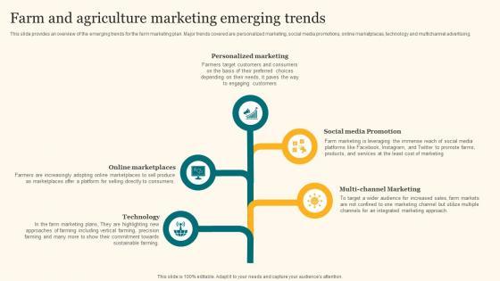 This slide provides an overview of the emerging trends for the farm marketing plan. Major trends covered are personalized marketing, social media promotions, online marketplaces, technology and multichannel advertising. Coming up with a presentation necessitates that the majority of the effort goes into the content and the message you intend to convey. The visuals of a PowerPoint presentation can only be effective if it supplements and supports the story that is being told. Keeping this in mind our experts created Farm And Agriculture Marketing Emerging Trends Agricultural Product Promotion Topics Pdf to reduce the time that goes into designing the presentation. This way, you can concentrate on the message while our designers take care of providing you with the right template for the situation. This slide provides an overview of the emerging trends for the farm marketing plan. Major trends covered are personalized marketing, social media promotions, online marketplaces, technology and multichannel advertising.