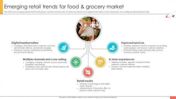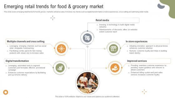 This slide covers emerging retail trends for food and grocery market to enhance sales. It involves key trends such as digital transformation, in store experiences, cross selling and optimizing retail media. Whether you have daily or monthly meetings, a brilliant presentation is necessary. Marketing Strategies For Effective Emerging Retail Trends For Food And Grocery can be your best option for delivering a presentation. Represent everything in detail using Marketing Strategies For Effective Emerging Retail Trends For Food And Grocery and make yourself stand out in meetings. The template is versatile and follows a structure that will cater to your requirements. All the templates prepared by Slidegeeks are easy to download and edit. Our research experts have taken care of the corporate themes as well. So, give it a try and see the results. This slide covers emerging retail trends for food and grocery market to enhance sales. It involves key trends such as digital transformation, in store experiences, cross selling and optimizing retail media.