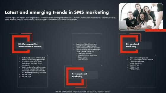 This slide represents the SMS marketing trends to help brand in communicating its business values in diverse manner and to break market boundaries. It includes details related to emerging SMS marketing trends such as RCS messaging, conversational marketing etc. Slidegeeks has constructed Latest And Emerging Trends In SMS Marketing Text Message Marketing Strategies Pictures Pdf after conducting extensive research and examination. These presentation templates are constantly being generated and modified based on user preferences and critiques from editors. Here, you will find the most attractive templates for a range of purposes while taking into account ratings and remarks from users regarding the content. This is an excellent jumping-off point to explore our content and will give new users an insight into our top-notch PowerPoint Templates. This slide represents the SMS marketing trends to help brand in communicating its business values in diverse manner and to break market boundaries. It includes details related to emerging SMS marketing trends such as RCS messaging, conversational marketing etc.