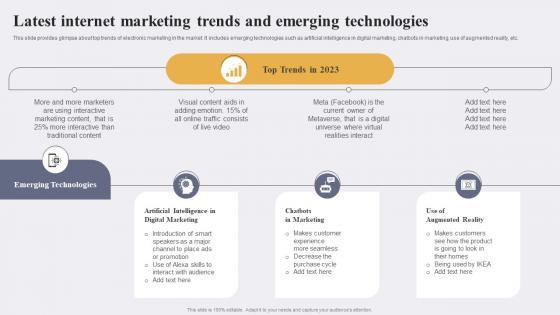 This slide provides glimpse about top trends of electronic marketing in the market. It includes emerging technologies such as artificial intelligence in digital marketing, chatbots in marketing, use of augmented reality, etc.Are you in need of a template that can accommodate all of your creative concepts This one is crafted professionally and can be altered to fit any style. Use it with Google Slides or PowerPoint. Include striking photographs, symbols, depictions, and other visuals. Fill, move around, or remove text boxes as desired. Test out color palettes and font mixtures. Edit and save your work, or work with colleagues. Download Latest Internet Marketing Trends And Emerging Enhancing Conversion Rate By Leveraging Structure Pdf and observe how to make your presentation outstanding. Give an impeccable presentation to your group and make your presentation unforgettable. This slide provides glimpse about top trends of electronic marketing in the market. It includes emerging technologies such as artificial intelligence in digital marketing, chatbots in marketing, use of augmented reality, etc.