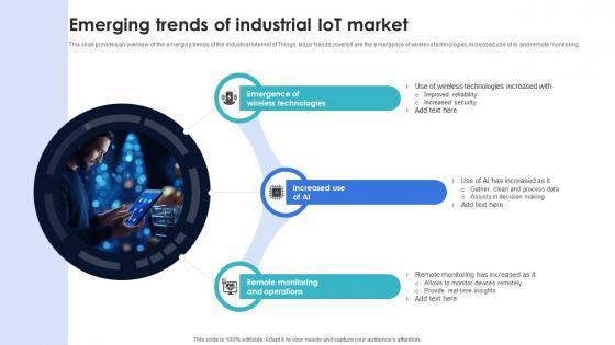 This slide provides an overview of the emerging trends of the industrial Internet of Things. Major trends covered are the emergence of wireless technologies, increased use of AI and remote monitoring. The best PPT templates are a great way to save time, energy, and resources. Slidegeeks have 100 percent editable powerpoint slides making them incredibly versatile. With these quality presentation templates, you can create a captivating and memorable presentation by combining visually appealing slides and effectively communicating your message. Download Optimization Of IoT Remote Monitoring Emerging Trends Of Industrial IoT Market IoT SS V from Slidegeeks and deliver a wonderful presentation. This slide provides an overview of the emerging trends of the industrial Internet of Things. Major trends covered are the emergence of wireless technologies, increased use of AI and remote monitoring.