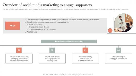 This slide provides insight into social media marketing used to raise funds and engage donors. It covers the purpose and benefits which are helps to increase awareness, attract volunteers and analyze strategy performance.Present like a pro with Overview Of Social Media Marketing To Engage Supporters Efficient Nonprofit Marketing Ideas Pdf Create beautiful presentations together with your team, using our easy-to-use presentation slides. Share your ideas in real-time and make changes on the fly by downloading our templates. So whether you are in the office, on the go, or in a remote location, you can stay in sync with your team and present your ideas with confidence. With Slidegeeks presentation got a whole lot easier. Grab these presentations today. This slide provides insight into social media marketing used to raise funds and engage donors. It covers the purpose and benefits which are helps to increase awareness, attract volunteers and analyze strategy performance.