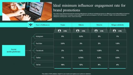 This slide covers ideal benchmarks for checking effectiveness of referral marketing programs on different social media platforms based on categories of influencers. It includes social media platforms such as Instagram, YouTube, Facebook, Twitter, etc based on influencer categories covering nano, micro, macro and mega,Crafting an eye-catching presentation has never been more straightforward. Let your presentation shine with this tasteful yet straightforward Ideal Minimum Influencer Engagement Rate For Brand Word Of Mouth Marketing Summary Pdf template. It offers a minimalistic and classy look that is great for making a statement. The colors have been employed intelligently to add a bit of playfulness while still remaining professional. Construct the ideal Ideal Minimum Influencer Engagement Rate For Brand Word Of Mouth Marketing Summary Pdf that effortlessly grabs the attention of your audience. Begin now and be certain to wow your customers. This slide covers ideal benchmarks for checking effectiveness of referral marketing programs on different social media platforms based on categories of influencers. It includes social media platforms such as Instagram, YouTube, Facebook, Twitter, etc based on influencer categories covering nano, micro, macro and mega