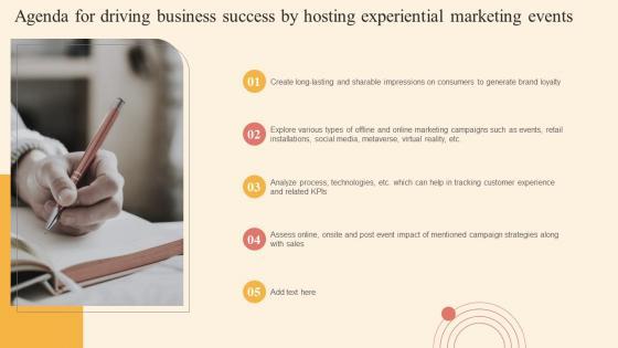 Find a pre designed and impeccable Agenda For Driving Business Success By Hosting Experiential Marketing Events Infographics Pdf. The templates can ace your presentation without additional effort. You can download these easy to edit presentation templates to make your presentation stand out from others. So, what are you waiting for Download the template from Slidegeeks today and give a unique touch to your presentation. Our Agenda For Driving Business Success By Hosting Experiential Marketing Events Infographics Pdf are topically designed to provide an attractive backdrop to any subject. Use them to look like a presentation pro.
