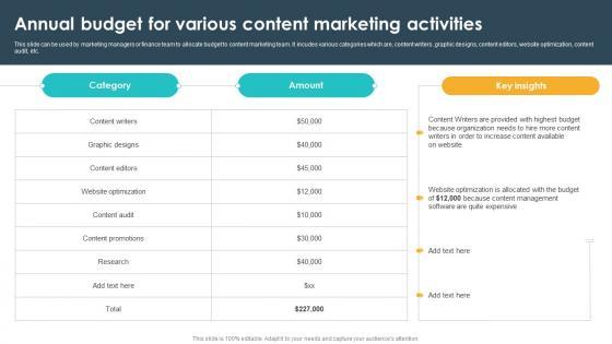 This slide can be used by marketing managers or finance team to allocate budget to content marketing team. It incudes various categories which are, content writers ,graphic designs, content editors, website optimization, content audit, etc. Create an editable Annual Budget For Various Content Marketing Activities Seo Content Plan To Drive Strategy SS V that communicates your idea and engages your audience. Whether you are presenting a business or an educational presentation, pre-designed presentation templates help save time. Annual Budget For Various Content Marketing Activities Seo Content Plan To Drive Strategy SS V is highly customizable and very easy to edit, covering many different styles from creative to business presentations. Slidegeeks has creative team members who have crafted amazing templates. So, go and get them without any delay. This slide can be used by marketing managers or finance team to allocate budget to content marketing team. It incudes various categories which are, content writers ,graphic designs, content editors, website optimization, content audit, etc.