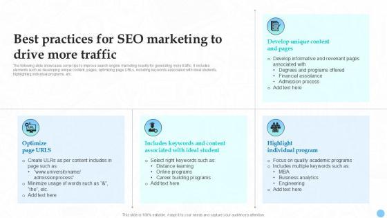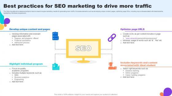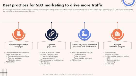 Slidegeeks is here to make your presentations a breeze with Best Practices For Seo Marketing To Drive More Traffic Key Step To Implementation University Strategy SS V With our easy-to-use and customizable templates, you can focus on delivering your ideas rather than worrying about formatting. With a variety of designs to choose from, you are sure to find one that suits your needs. And with animations and unique photos, illustrations, and fonts, you can make your presentation pop. So whether you are giving a sales pitch or presenting to the board, make sure to check out Slidegeeks first The following slide showcases some tips to improve search engine marketing results for generating more traffic. It includes elements such as developing unique content, pages, optimizing page URLs, including keywords associated with ideal students, highlighting individual programs etc.