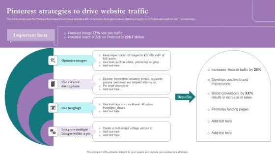 This slide showcases the Pinterest techniques to increase website traffic. It includes strategies such as optimize images, use creative descriptions and use hash tags. Do you have an important presentation coming up Are you looking for something that will make your presentation stand out from the rest Look no further than Pinterest Strategies To Drive Website Comprehensive Marketing Guide For Tourism Industry Icons Pdf. With our professional designs, you can trust that your presentation will pop and make delivering it a smooth process. And with Slidegeeks, you can trust that your presentation will be unique and memorable. So why wait Grab Pinterest Strategies To Drive Website Comprehensive Marketing Guide For Tourism Industry Icons Pdf today and make your presentation stand out from the rest This slide showcases the Pinterest techniques to increase website traffic. It includes strategies such as optimize images, use creative descriptions and use hash tags.