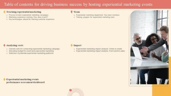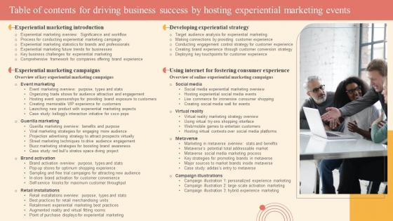 The best PPT templates are a great way to save time, energy, and resources. Slidegeeks have 100 percent editable powerpoint slides making them incredibly versatile. With these quality presentation templates, you can create a captivating and memorable presentation by combining visually appealing slides and effectively communicating your message. Download Table Of Contents For Driving Business Success By Hosting Experiential Marketing Events Mockup Pdf from Slidegeeks and deliver a wonderful presentation. Our Table Of Contents For Driving Business Success By Hosting Experiential Marketing Events Mockup Pdf are topically designed to provide an attractive backdrop to any subject. Use them to look like a presentation pro.