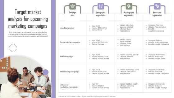 This slide covers target market segmentation for the marketing campaign. It includes segmentation details based on demographic, psychographic, and behavioral. Retrieve professionally designed Target Market Analysis For Implementing Marketing Tactics To Drive Template Pdf to effectively convey your message and captivate your listeners. Save time by selecting pre made slideshows that are appropriate for various topics, from business to educational purposes. These themes come in many different styles, from creative to corporate, and all of them are easily adjustable and can be edited quickly. Access them as PowerPoint templates or as Google Slides themes. You do not have to go on a hunt for the perfect presentation because Slidegeeks got you covered from everywhere. This slide covers target market segmentation for the marketing campaign. It includes segmentation details based on demographic, psychographic, and behavioral.