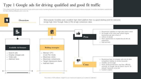This slide provides glimpse about using Google ads for paid media marketing that help the businesses to display the ads in front of millions of people. It includes description, available ad formats, bidding strategies, pros, cons, etc. Presenting this PowerPoint presentation, titled Type 1 Google Ads For Driving Comprehensive Guide For Paid Media Marketing Strategies Infographics Pdf, with topics curated by our researchers after extensive research. This editable presentation is available for immediate download and provides attractive features when used. Download now and captivate your audience. Presenting this Type 1 Google Ads For Driving Comprehensive Guide For Paid Media Marketing Strategies Infographics Pdf. Our researchers have carefully researched and created these slides with all aspects taken into consideration. This is a completely customizable Type 1 Google Ads For Driving Comprehensive Guide For Paid Media Marketing Strategies Infographics Pdf that is available for immediate downloading. Download now and make an impact on your audience. Highlight the attractive features available with our PPTs. This slide provides glimpse about using Google ads for paid media marketing that help the businesses to display the ads in front of millions of people. It includes description, available ad formats, bidding strategies, pros, cons, etc.