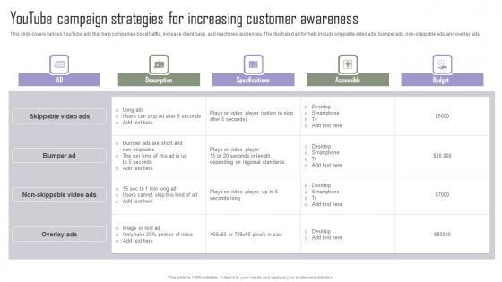 This slide covers various YouTube ads that help companies boost traffic, increase client base, and reach new audiences. The illustrated ad formats include skippable video ads, bumper ads, non skippable ads, and overlay ads. Presenting this PowerPoint presentation, titled Youtube Campaign Strategies For Implementing Marketing Tactics To Drive Ideas Pdf, with topics curated by our researchers after extensive research. This editable presentation is available for immediate download and provides attractive features when used. Download now and captivate your audience. Presenting this Youtube Campaign Strategies For Implementing Marketing Tactics To Drive Ideas Pdf. Our researchers have carefully researched and created these slides with all aspects taken into consideration. This is a completely customizable Youtube Campaign Strategies For Implementing Marketing Tactics To Drive Ideas Pdf that is available for immediate downloading. Download now and make an impact on your audience. Highlight the attractive features available with our PPTs. This slide covers various YouTube ads that help companies boost traffic, increase client base, and reach new audiences. The illustrated ad formats include skippable video ads, bumper ads, non skippable ads, and overlay ads.