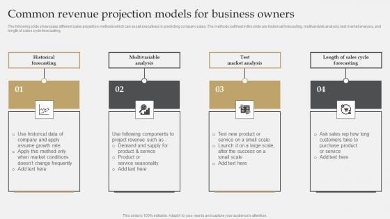 The following slide showcases different sales projection methods which can assist executives in predicting company sales. The methods outlined in the slide are historical forecasting, multivariable analysis, test market analysis, and length of sales cycle forecasting. Do you have to make sure that everyone on your team knows about any specific topic I yes, then you should give Market Evaluation Of IT Industry Common Revenue Projection Models For Business Owners Mockup PDF a try. Our experts have put a lot of knowledge and effort into creating this impeccable Market Evaluation Of IT Industry Common Revenue Projection Models For Business Owners Mockup PDF. You can use this template for your upcoming presentations, as the slides are perfect to represent even the tiniest detail. You can download these templates from the Slidegeeks website and these are easy to edit. So grab these today.