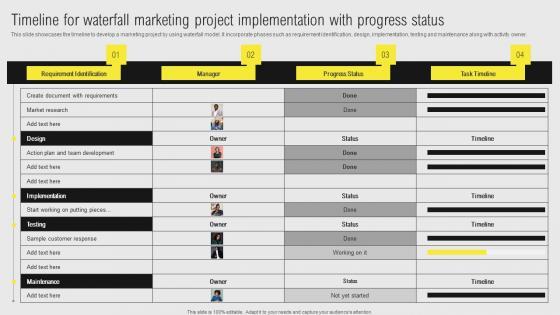 This slide showcases the timeline to develop a marketing project by using waterfall model. It incorporate phases such as requirement identification, design, implementation, testing and maintenance along with activity owner. Are you in need of a template that can accommodate all of your creative concepts This one is crafted professionally and can be altered to fit any style. Use it with Google Slides or PowerPoint. Include striking photographs, symbols, depictions, and other visuals. Fill, move around, or remove text boxes as desired. Test out color palettes and font mixtures. Edit and save your work, or work with colleagues. Download IT Projects Administration Through Waterfall Timeline For Waterfall Marketing Project Diagrams Pdf and observe how to make your presentation outstanding. Give an impeccable presentation to your group and make your presentation unforgettable. This slide showcases the timeline to develop a marketing project by using waterfall model. It incorporate phases such as requirement identification, design, implementation, testing and maintenance along with activity owner.