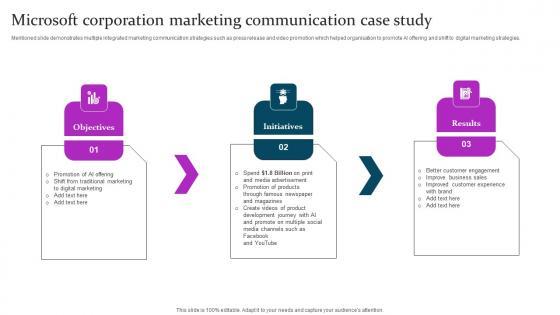 Mentioned slide demonstrates multiple integrated marketing communication strategies such as press release and video promotion which helped organisation to promote AI offering and shift to digital marketing strategies. Are you searching for a Marketing Mix Communication Guide Client Microsoft Corporation Marketing Microsoft Pdf that is uncluttered, straightforward, and original Its easy to edit, and you can change the colors to suit your personal or business branding. For a presentation that expresses how much effort you have put in, this template is ideal With all of its features, including tables, diagrams, statistics, and lists, its perfect for a business plan presentation. Make your ideas more appealing with these professional slides. Download Marketing Mix Communication Guide Client Microsoft Corporation Marketing Microsoft Pdf from Slidegeeks today. Mentioned slide demonstrates multiple integrated marketing communication strategies such as press release and video promotion which helped organisation to promote AI offering and shift to digital marketing strategies.