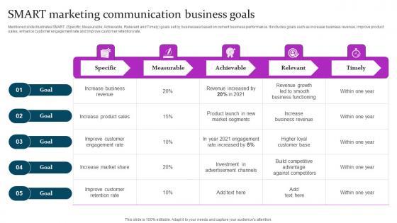 Mentioned slide illustrates SMART Specific, Measurable, Achievable, Relevant and Timely goals set by businesses based on current business performance. It includes goals such as increase business revenue, improve product sales, enhance customer engagement rate and improve customer retention rate, Presenting this PowerPoint presentation, titled Marketing Mix Communication Guide Client Smart Marketing Communication Themes Pdf, with topics curated by our researchers after extensive research. This editable presentation is available for immediate download and provides attractive features when used. Download now and captivate your audience. Presenting this Marketing Mix Communication Guide Client Smart Marketing Communication Themes Pdf. Our researchers have carefully researched and created these slides with all aspects taken into consideration. This is a completely customizable Marketing Mix Communication Guide Client Smart Marketing Communication Themes Pdf that is available for immediate downloading. Download now and make an impact on your audience. Highlight the attractive features available with our PPTs. Mentioned slide illustrates SMART Specific, Measurable, Achievable, Relevant and Timely goals set by businesses based on current business performance. It includes goals such as increase business revenue, improve product sales, enhance customer engagement rate and improve customer retention rate