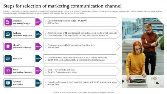 Following slide includes six step right marketing communication channel selection process which can be used by businesses to improve customer targeting strategies. It includes steps such as establish marketing budget, evaluate resources available, identify potential audience, conduct research, rank marketing channels, and monitor and review . Here you can discover an assortment of the finest PowerPoint and Google Slides templates. With these templates, you can create presentations for a variety of purposes while simultaneously providing your audience with an eye catching visual experience. Download Marketing Mix Communication Guide Client Steps Selection Marketing Communication Portrait Pdf to deliver an impeccable presentation. These templates will make your job of preparing presentations much quicker, yet still, maintain a high level of quality. Slidegeeks has experienced researchers who prepare these templates and write high quality content for you. Later on, you can personalize the content by editing the Marketing Mix Communication Guide Client Steps Selection Marketing Communication Portrait Pdf. Following slide includes six step right marketing communication channel selection process which can be used by businesses to improve customer targeting strategies. It includes steps such as establish marketing budget, evaluate resources available, identify potential audience, conduct research, rank marketing channels, and monitor and review .