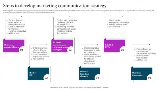 Following slide demonstrates six step process for development of marketing communication strategies which can be used by business for customer engagement. It includes steps such as target audience assessment, identify USP Unique Selling Preposition, set marketing mix communication strategies, etc. This Marketing Mix Communication Guide Client Steps To Develop Marketing Download Pdf from Slidegeeks makes it easy to present information on your topic with precision. It provides customization options, so you can make changes to the colors, design, graphics, or any other component to create a unique layout. It is also available for immediate download, so you can begin using it right away. Slidegeeks has done good research to ensure that you have everything you need to make your presentation stand out. Make a name out there for a brilliant performance. Following slide demonstrates six step process for development of marketing communication strategies which can be used by business for customer engagement. It includes steps such as target audience assessment, identify USP Unique Selling Preposition, set marketing mix communication strategies, etc.