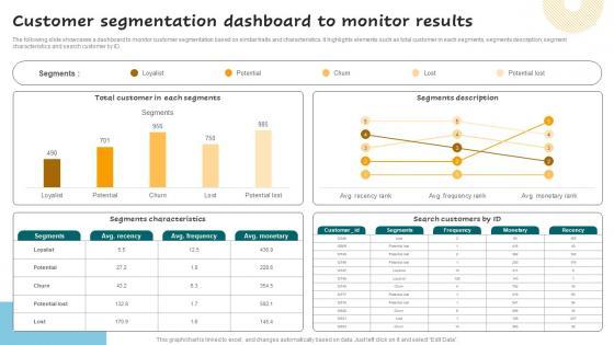 The following slide showcases a dashboard to monitor customer segmentation based on similar traits and characteristics. It highlights elements such as total customer in each segments, segments description, segment characteristics and search customer by ID. Get a simple yet stunning designed Customer Segmentation Dashboard To Monitor Successful Guide For Market Segmentation Formats Pdf. It is the best one to establish the tone in your meetings. It is an excellent way to make your presentations highly effective. So, download this PPT today from Slidegeeks and see the positive impacts. Our easy-to-edit Customer Segmentation Dashboard To Monitor Successful Guide For Market Segmentation Formats Pdf can be your go-to option for all upcoming conferences and meetings. So, what are you waiting for Grab this template today. The following slide showcases a dashboard to monitor customer segmentation based on similar traits and characteristics. It highlights elements such as total customer in each segments, segments description, segment characteristics and search customer by ID.