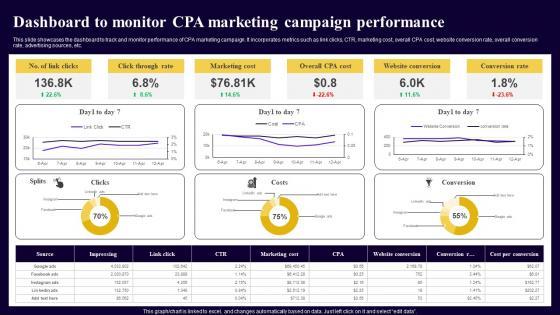 This slide showcases the dashboard to track and monitor performance of CPA marketing campaign. It incorporates metrics such as link clicks, CTR, marketing cost, overall CPA cost, website conversion rate, overall conversion rate, advertising sources, etc. Here you can discover an assortment of the finest PowerPoint and Google Slides templates. With these templates, you can create presentations for a variety of purposes while simultaneously providing your audience with an eye catching visual experience. Download Dashboard To Monitor CPA Marketing Campaign Performance Ppt Slides Examples PDF to deliver an impeccable presentation. These templates will make your job of preparing presentations much quicker, yet still, maintain a high level of quality. Slidegeeks has experienced researchers who prepare these templates and write high quality content for you. Later on, you can personalize the content by editing the Dashboard To Monitor CPA Marketing Campaign Performance Ppt Slides Examples PDF.