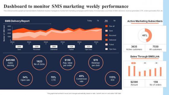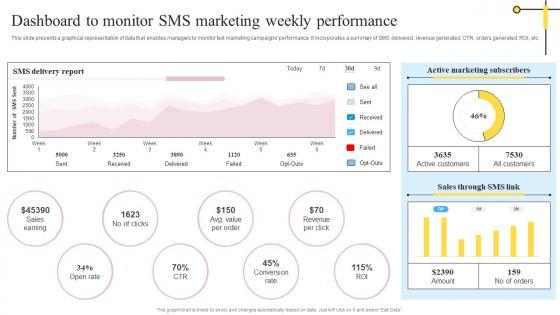 This slide presents a graphical representation of data that enables managers to monitor text marketing campaigns performance. It incorporates a summary of SMS delivered, revenue generated, CTR, orders generated, ROI, etc. Get a simple yet stunning designed Dashboard To Monitor SMS Marketing Weekly Performance In Depth Overview Of Mass Rules Pdf It is the best one to establish the tone in your meetings. It is an excellent way to make your presentations highly effective. So, download this PPT today from Slidegeeks and see the positive impacts. Our easy-to-edit Dashboard To Monitor SMS Marketing Weekly Performance In Depth Overview Of Mass Rules Pdf can be your go-to option for all upcoming conferences and meetings. So, what are you waiting for Grab this template today. This slide presents a graphical representation of data that enables managers to monitor text marketing campaigns performance. It incorporates a summary of SMS delivered, revenue generated, CTR, orders generated, ROI, etc.