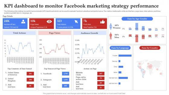 The following slide outlines key performance indicator KPI dashboard which can be used to evaluate Facebook advertisement performance. The metrics mentioned in slide are total fans, page views, total actions, post likes, audience growth, fans by language, etc. Do you know about Slidesgeeks Facebook Marketing Techniques KPI Dashboard To Monitor Facebook Marketing Strategy SS V These are perfect for delivering any kind od presentation. Using it, create PowerPoint presentations that communicate your ideas and engage audiences. Save time and effort by using our pre-designed presentation templates that are perfect for a wide range of topic. Our vast selection of designs covers a range of styles, from creative to business, and are all highly customizable and easy to edit. Download as a PowerPoint template or use them as Google Slides themes. The following slide outlines key performance indicator KPI dashboard which can be used to evaluate Facebook advertisement performance. The metrics mentioned in slide are total fans, page views, total actions, post likes, audience growth, fans by language, etc.