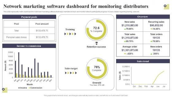 This slide represents metric dashboard for multi-level marketing software that helps marketers to track and monitor network participants progress. It covers details regarding training, sales etc. Find a pre-designed and impeccable Network Marketing Software Dashboard For Monitoring Distributors Multi Level Marketing Designs Pdf The templates can ace your presentation without additional effort. You can download these easy-to-edit presentation templates to make your presentation stand out from others. So, what are you waiting for Download the template from Slidegeeks today and give a unique touch to your presentation. This slide represents metric dashboard for multi-level marketing software that helps marketers to track and monitor network participants progress. It covers details regarding training, sales etc.