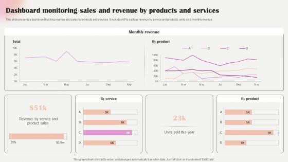 This slide presents a dashboard tracking revenue and sales by products and services. It includes KPIs such as revenue by service and products, units sold, monthly revenue. Make sure to capture your audiences attention in your business displays with our gratis customizable Strategic Marketing For Hair And Beauty Salon To Increase Dashboard Monitoring Sales Slides PDF. These are great for business strategies, office conferences, capital raising or task suggestions. If you desire to acquire more customers for your tech business and ensure they stay satisfied, create your own sales presentation with these plain slides.