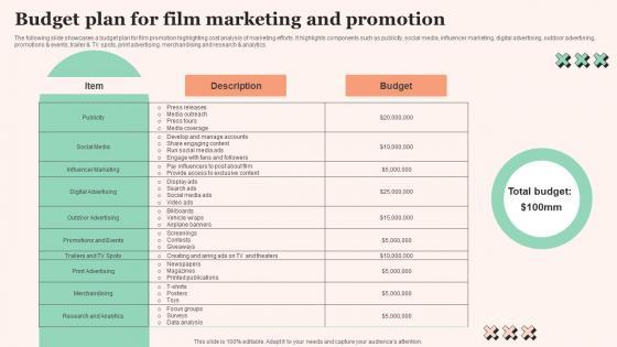 The following slide showcases a budget plan for film promotion highlighting cost breakdown of marketing efforts for movie marketing. It highlights components such as publicity, social media, influencer marketing, digital advertising, outdoor advertising, promotions and events, trailer and TV spots, print advertising, merchandising and research and analytics. This Film Marketing Budget Film Promotional Techniques To Increase Box Office Collection Icons Pdf from Slidegeeks makes it easy to present information on your topic with precision. It provides customization options, so you can make changes to the colors, design, graphics, or any other component to create a unique layout. It is also available for immediate download, so you can begin using it right away. Slidegeeks has done good research to ensure that you have everything you need to make your presentation stand out. Make a name out there for a brilliant performance. The following slide showcases a budget plan for film promotion highlighting cost breakdown of marketing efforts for movie marketing. It highlights components such as publicity, social media, influencer marketing, digital advertising, outdoor advertising, promotions and events, trailer and TV spots, print advertising, merchandising and research and analytics.
