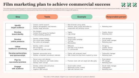 This slide presents a marketing plan for movie promotion to reach it intended audience and generate buzz for film success. It showcases key steps such as identify target audience, develop brand identity, develop online presence, utilize traditional advertising, develop partnerships and sponsorships, plan for successful premiere, engage with audience. Do you know about Slidesgeeks Film Marketing Plan Achieve Film Promotional Techniques To Increase Box Office Collection Themes Pdf These are perfect for delivering any kind od presentation. Using it, create PowerPoint presentations that communicate your ideas and engage audiences. Save time and effort by using our pre designed presentation templates that are perfect for a wide range of topic. Our vast selection of designs covers a range of styles, from creative to business, and are all highly customizable and easy to edit. Download as a PowerPoint template or use them as Google Slides themes. This slide presents a marketing plan for movie promotion to reach it intended audience and generate buzz for film success. It showcases key steps such as identify target audience, develop brand identity, develop online presence, utilize traditional advertising, develop partnerships and sponsorships, plan for successful premiere, engage with audience.